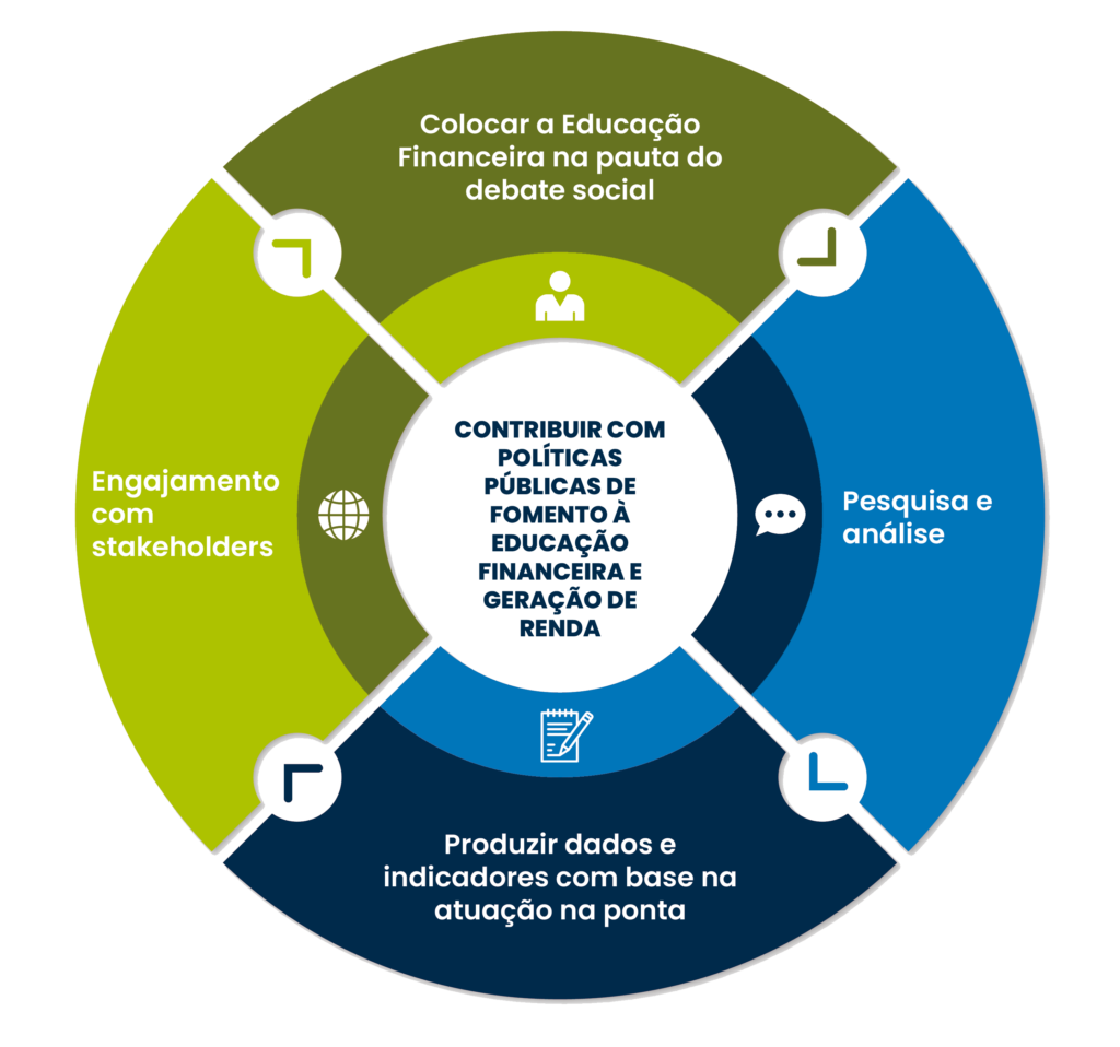 Fazemos advocacy pela Educação Financeira e contribuímos para a construção de políticas públicas inclusivas e eficazes, trabalhando em parceria com governos, ONGs, comunidades e sociedade civil para promover programas educacionais e iniciativas de conscientização. Nossa estratégia de advocacy está organizada em 4 eixos complementares, com o objetivo de garantir acesso igualitário a recursos e conhecimentos que permitam que pessoas em situação de vulnerabilidade social também possam alcançar seus sonhos financeiros e contribuir para o desenvolvimento sustentável do país.